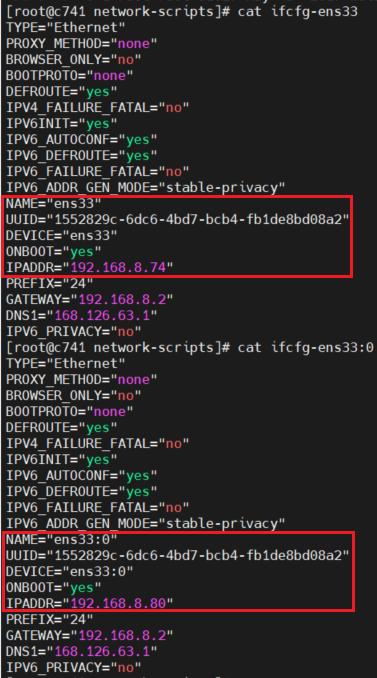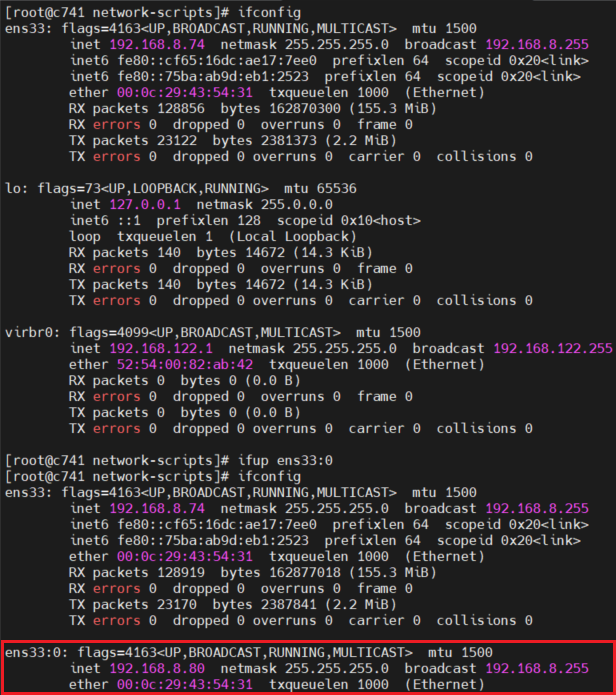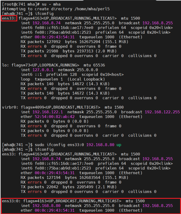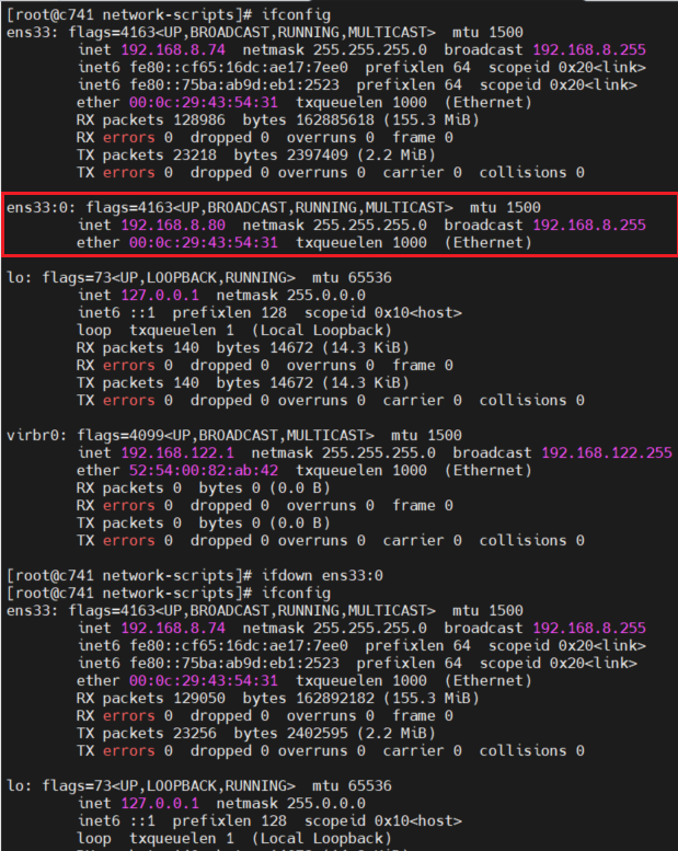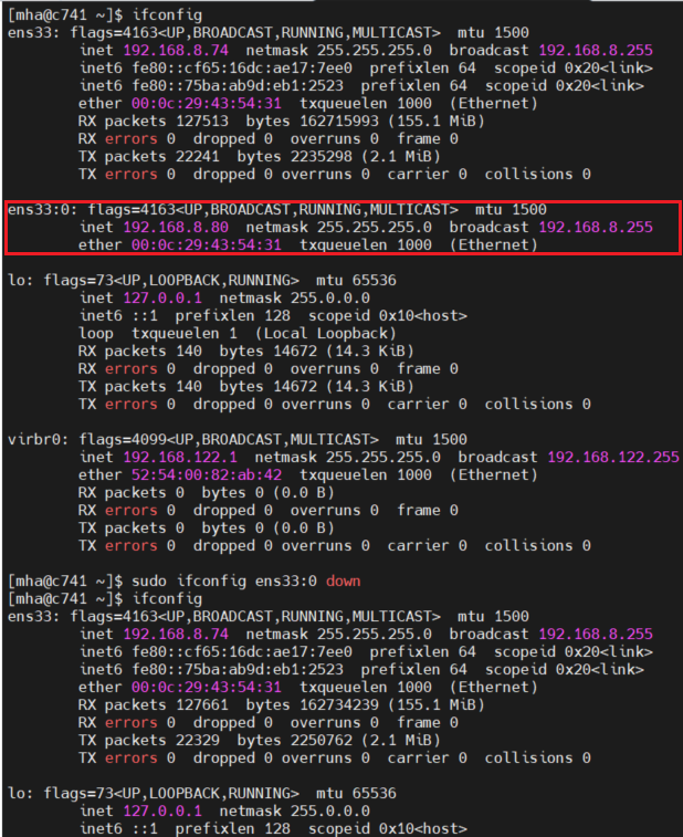 ifconfig sudo ifconfig ens33:0 192.168.8.80 up # ens33은 자신의 인터페이스 이름에 맞게 작성