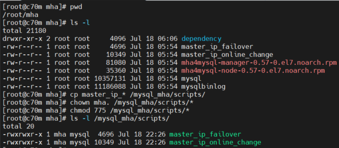 | su - pwd ls -l cp master_ip_* /mysql_mha/scripts/ chown mha. /mysql_mha/scripts/* chmod 775 /mysql_mha/scripts/* #권한이 644인 경우도 Can`t exec 에러 발생함 ls -l /mysql_mha/scripts/ |