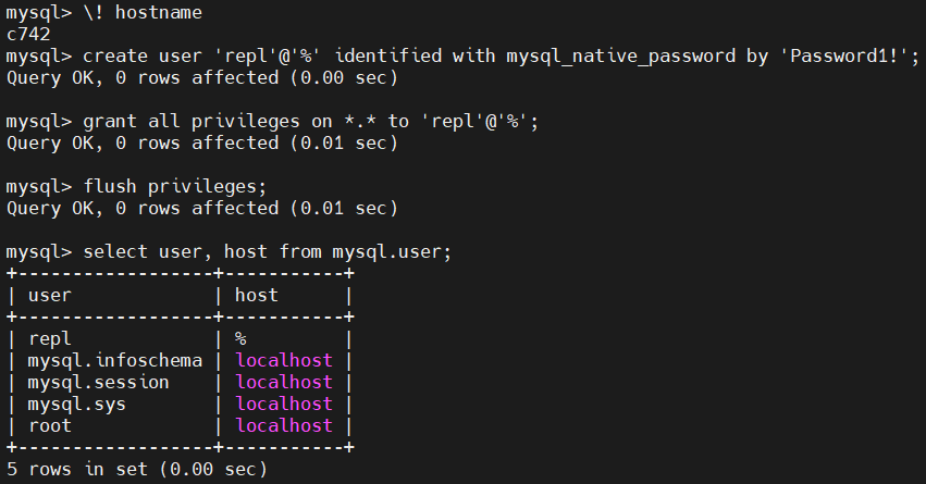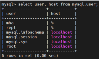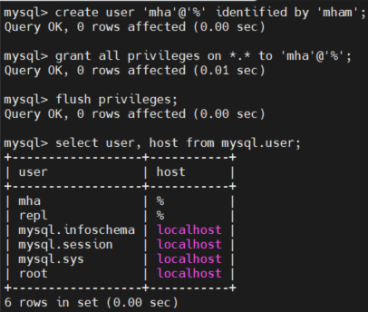 grant all privileges on *.* to 'mha'@'%'; flush privileges; select user, host from mysql.user; |