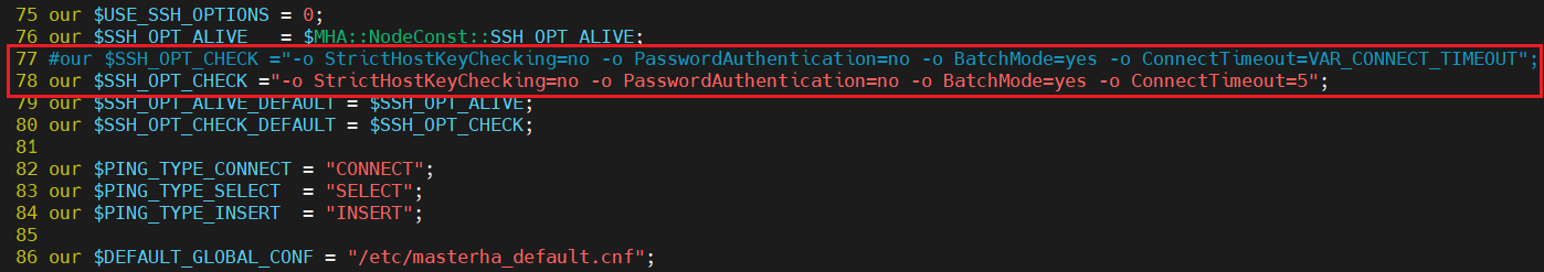 | su - vi /usr/share/perl5/vendor_perl/MHA/ManagerConst.pm our $SSH_OPT_CHECK ="-o StrictHostKeyChecking=no -o PasswordAuthentication=no -o BatchMode=yes -o ConnectTimeout=5"; # modified VAR_CONNECT_TIMEOUT이 정의되어 있지 않아 오류 발생
