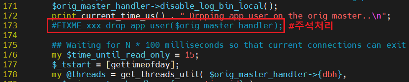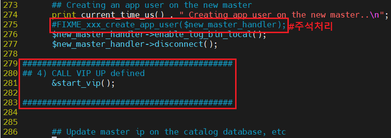 MHA에서 권고하는 Custom Script 수정과 함께, MHA failover의 서버 프로세스 정리 부문의 서버 비정상 종료 버그를 피하기 위해, MHA 매니저 설치 서버의 다음 엔진 스크립트 수정