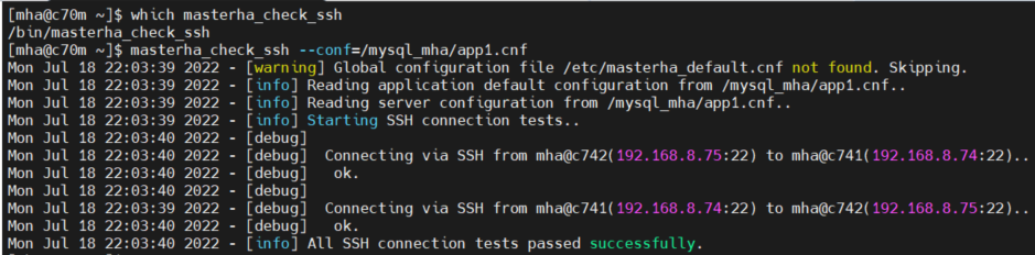 masterha_check_ssh --conf=/mysql_mha/app1.cnf