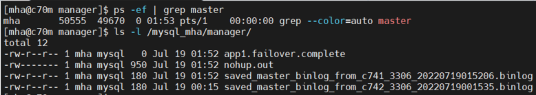| ps -ef | grep master ls -l /mysql_mha/manager/ |