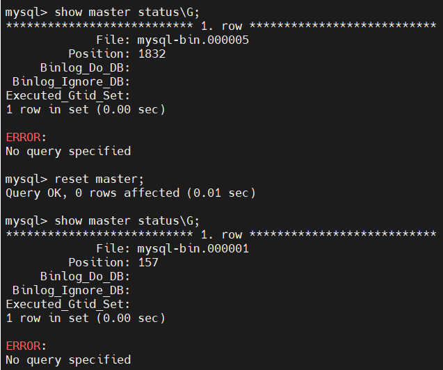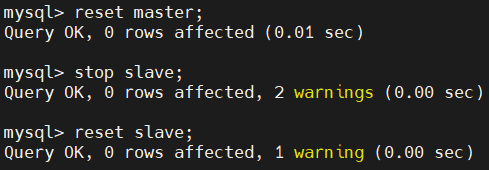 | [master] reset master; show master status\G; [slave] stop slave; reset slave; reset master; CHANGE MASTER TO