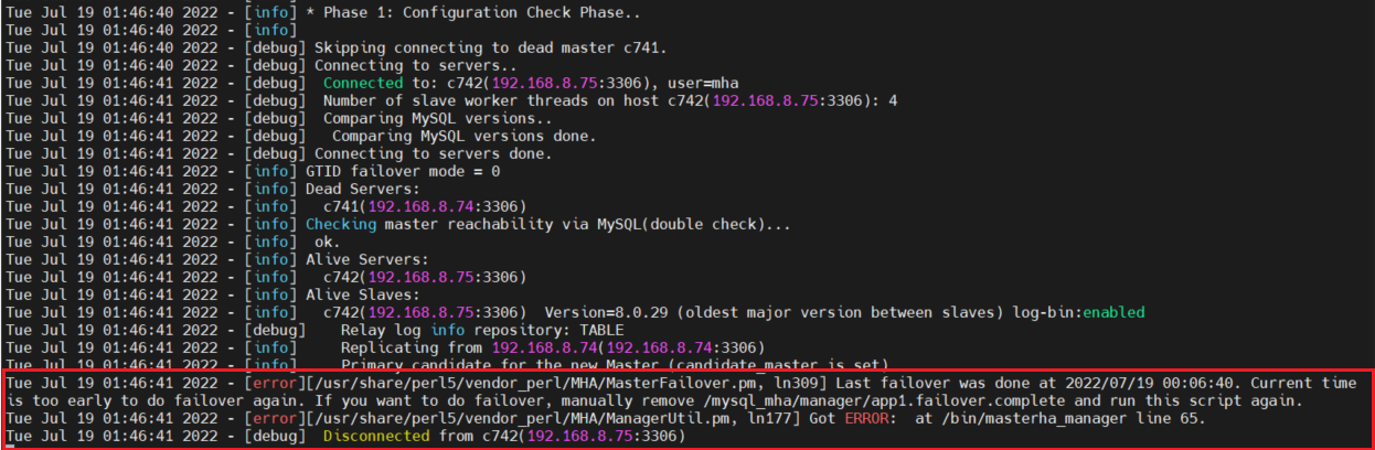[error][/usr/share/perl5/vendor_perl/MHA/MasterFailover.pm, ln309] Last failover was done at 2022/07/19 00:06:40. Current time is too early to do failover again. If you want to do failover, manually remove /mysql_mha/manager/app1.failover.complete and run this script again.