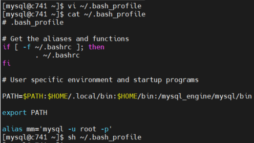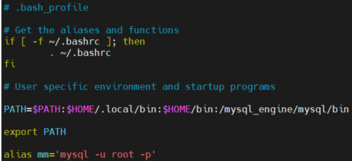 | # .bash_profile # Get the aliases and functions if [ -f ~/.bashrc ]; then . ~/.bashrc fi # User specific environment and startup programs PATH=$PATH:$HOME/.local/bin:$HOME/bin:/mysql_engine/mysql/bin export PATH alias mm='mysql -u root -p' |