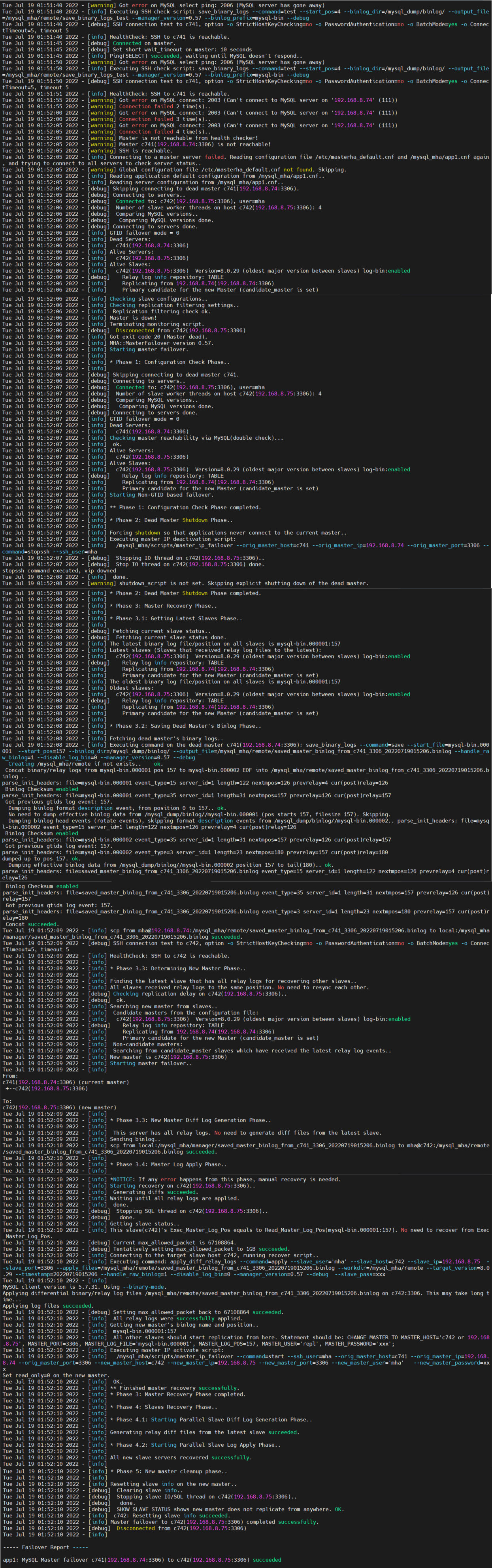 --orig_master_is_new_slave 옵션을 주게 되면 이전 마스터가 신규 마스터의 슬레이브로 설정되며, 이 옵션을 주지 않게 되면 이전 마스터는 신규 마스터의 슬레이브로 설정되지 않는다. --interactive=0 옵션을 주면 아래 실행 중 YES/NO를 묻지 않고 수행됨