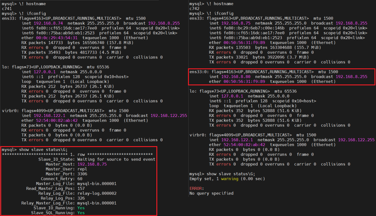 master가 되는 mysql 서버에 Virtual Interface(192.168.8.80)가 up 상태로 존재