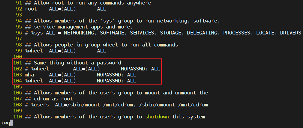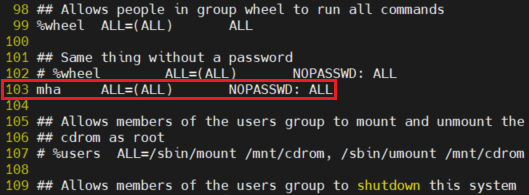 | visudo #쉘 명령어로 진입 아래 내용 추가 mha ALL=(ALL) NOPASSWD: ALL #mha 계정만 권한을 주거나 %wheel ALL=(ALL) NOPASSWD: ALL #mha가 속한 그룹에 권한을 주거나 |