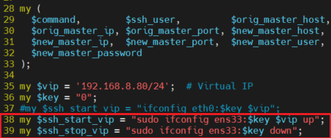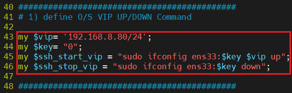 | vi /mysql_mha/scripts/master_ip_failover sudo ifconfig ens33:0 192.168.8.80/24 up #master/slave에서 동작하던 명령어 작성, ifup이라면 해당 형태로 작성 필요 sudo ifconfig ens33:$key $vip up #my $vip와 $key 변수에 넣은 값으로 치환 |
