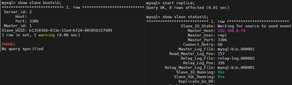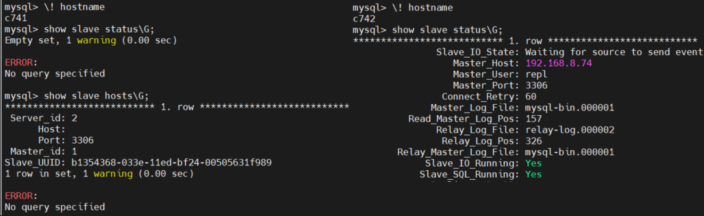 | [master] show slave hosts\G; [slave] show slave status\G; |