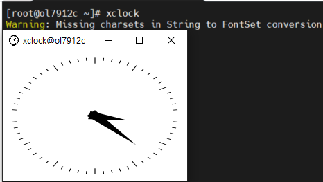 해당 패키지 설치 완료 후 root 계정으로 xclock 실행, x-windows가 지원되는 원격 접속 툴 사용해야 함(mobaXterm, xshell 등)