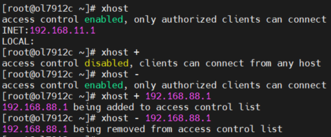 | xhost #현재 설정된 접근 목록 출력 xhost + #모든 클라이언트의 접속을 허용 xhost - #모든 클라이언트의 접속을 차단 xhost + ip #지정한 클라이언트의 접속을 허용 xhost - ip #지정한 클라이언트의 접속을 차단 |